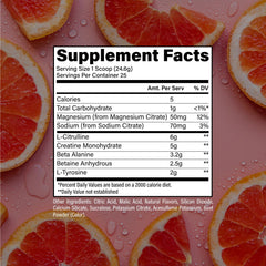 Each serving delivers a science-backed blend of performance enhancers: L-Citrulline for blood flow, Creatine for ATP-driven strength, Beta Alanine for endurance, Betaine for hydration and methylation support, and L‑Tyrosine for neurotransmitter-driven focus—all without caffeine.*